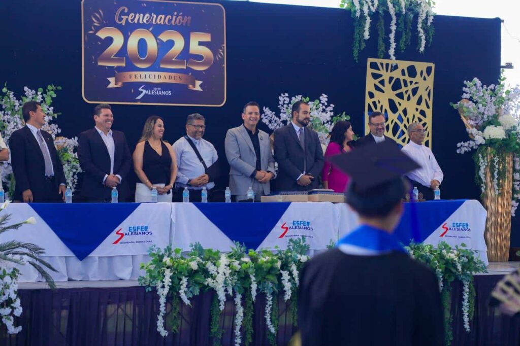 Chihuahua.- El alcalde Marco Bonilla fue padrino de la generación 2025 de la secundaria ESFER Salesianos, a quienes reconoció por su esfuerzo al culminar esta etapa de su vida, exhortándolos también a continuar preparándose para su futuro, ya que como mencionó “su destino depende de cada uno de ustedes”.