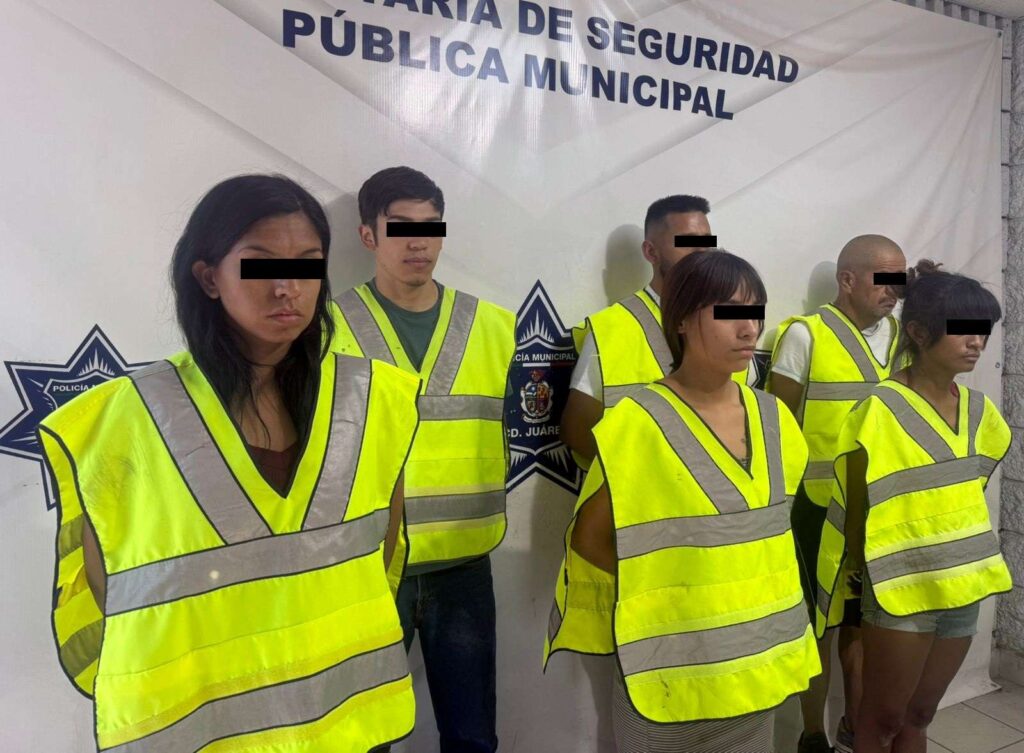 Ciudad Juárez .- Elementos de la Secretaría de Seguridad Pública Municipal arrestaron a Manuel Sergio H. R., Joel Z. V., María Isabel H. S., Febe Joadan B. L, Edgar Iván A. T. y Alexia Alejandra M. C., por su presunta responsabilidad en la comisión de delitos contra la salud y resistencia y desobediencia de particulares; una de las detenidas será investigada por el delito de secuestro.