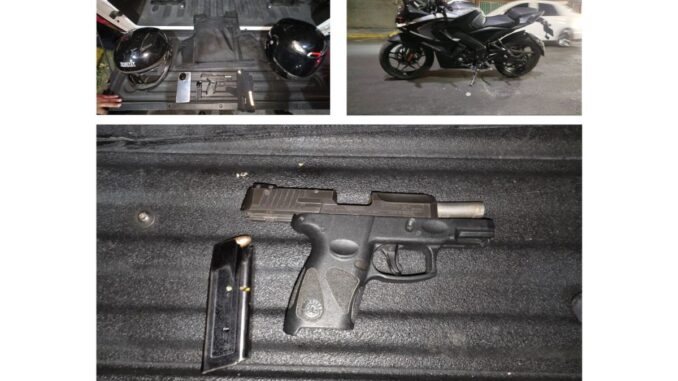 Derivado de una revisión preventiva se les aseguraron un arma de fuego corta con seis cartuchos útiles, un chaleco balístico, dos cascos de motocicleta y un teléfono celular.