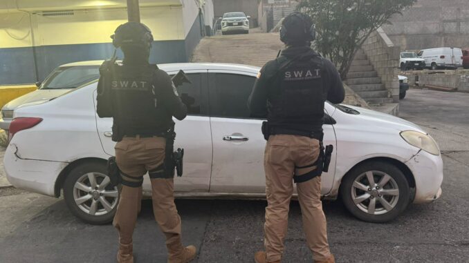 Al acercarse, observaron que en el vehículo había dos hombres con chalecos balísticos.