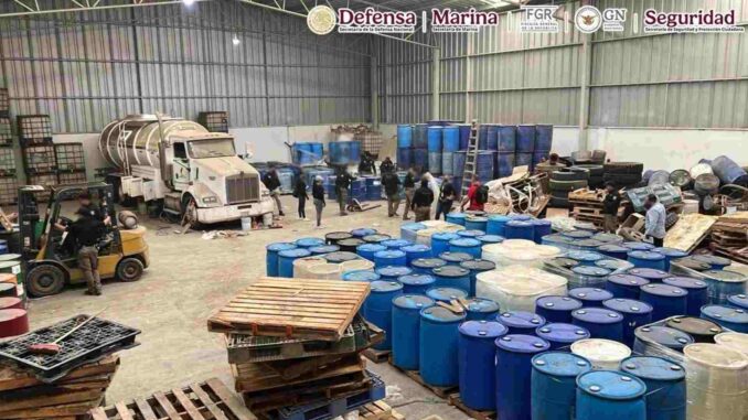 En los operativos fueron asegurados aproximadamente 300 bidones y tambos con precursores químicos, más de 2 mil costales con una sustancia granulada y una pipa con 7 mil litros de hidrocarburo.