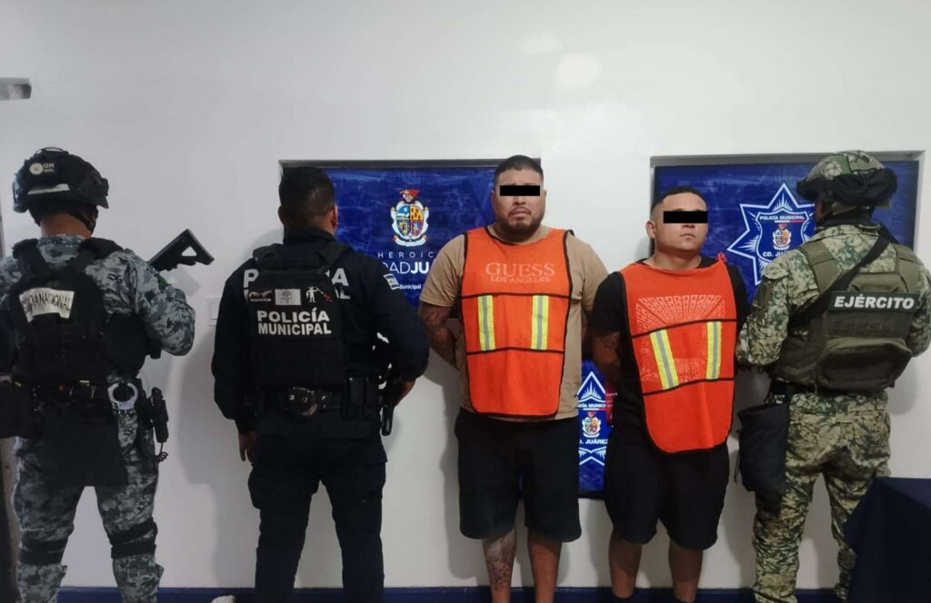 Ciudad Juárez .- Agentes de la Secretaría de Seguridad Pública Municipal en coordinación con elementos del Ejército Mexicano y Guardia Nacional que conforman el operativo interinstitucional, lograron la detención de Jesús Joaquín B. S. y José Gabriel P. H., por su presunta responsabilidad en la comisión de los delitos de homicidio en grado de tentativa, homicidio y contra la ley federal de armas de fuego y explosivos.