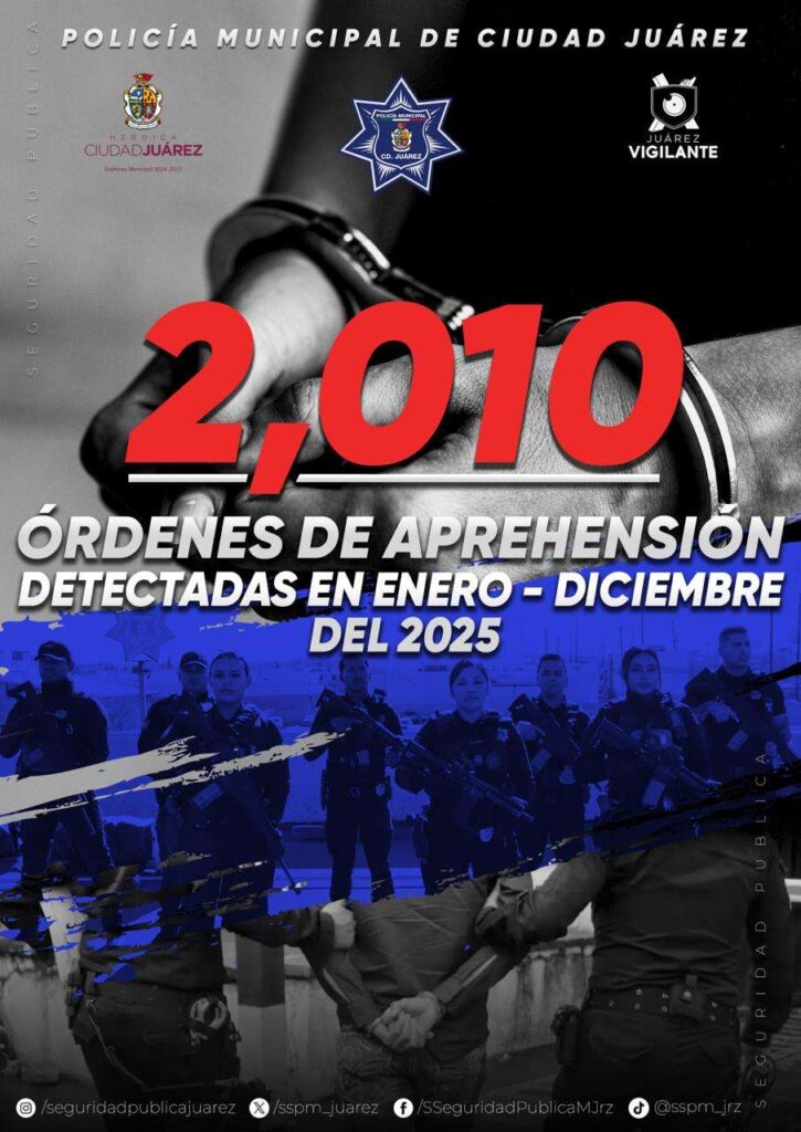 Ciudad Juárez.- La Secretaría de Seguridad Pública Municipal informa sobre los resultados relevantes durante el año 2025, obtenidos en cuanto a detección de mandamientos judiciales vigentes a través de las acciones y estrategias para la prevención del delito.