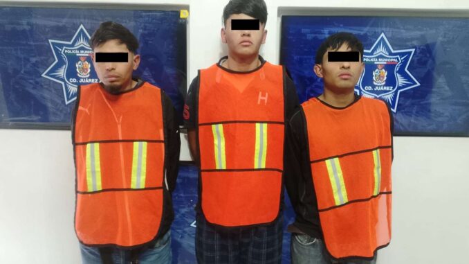 Ciudad Juárez.- Elementos de la Secretaría de Seguridad Pública Municipal, adscritos a la Estación de Policía del Distrito Riveras, arrestaron a Gustavo Armando R. H., Alejandro H. G. y Oscar Yahir H. J., por su presunta responsabilidad en la comisión del delito de robo a comercio con violencia.