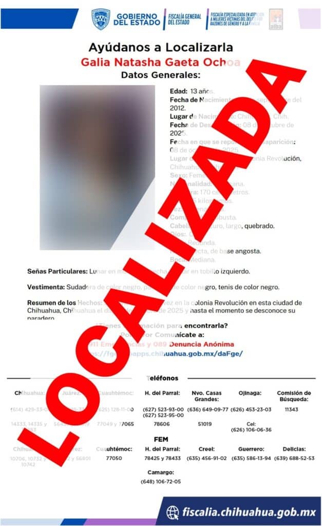 Tras localizarla en la colonia centro de esta ciudad, fue entrevistada en la Unidad de Niñas, Adolescentes y Mujeres Ausentes, descartó haber sido víctima de algún delito y mencionó que su ausencia fue voluntaria.