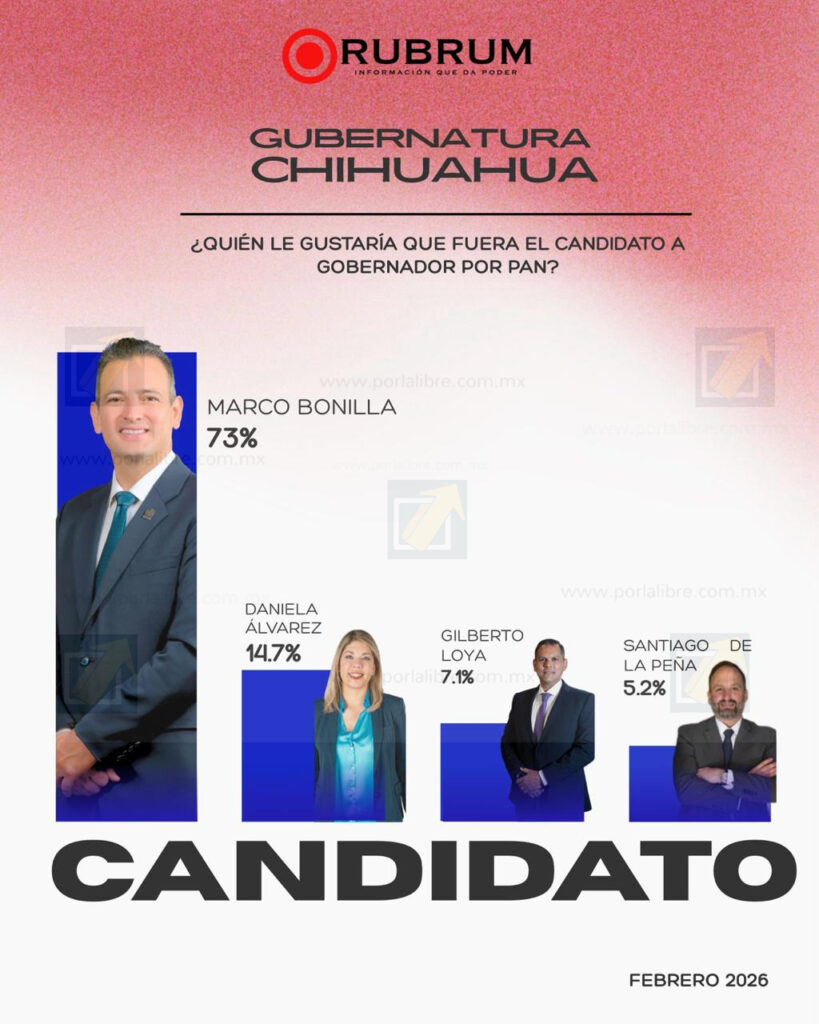 Chihuahua.- El alcalde de Chihuahua Marco Bonilla, está al frente de las preferencias ciudadanas con respecto a las candidaturas a la gubernatura rumbo al 2027 por el PAN de acuerdo a la última evaluación de la casa encuestadora RUBRUM.