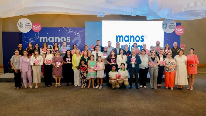 Chihuahua .- El alcalde Marco Bonilla y la presidenta del DIF Municipal, Karina Olivas, durante el evento «Manos Unidas por Chihuahua», entregaron distintivos a asociaciones civiles que se destacan por acciones para el bien común que brinden una mejor calidad de vida a las familias capitalinas.