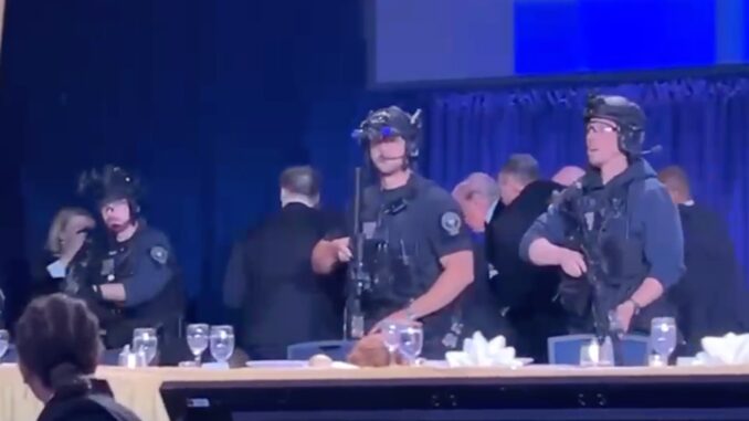 BREAKING: Trump was just rushed off the stage during the White House Correspondents’ Dinner. pic.twitter.com/s9w1FW9BJ7