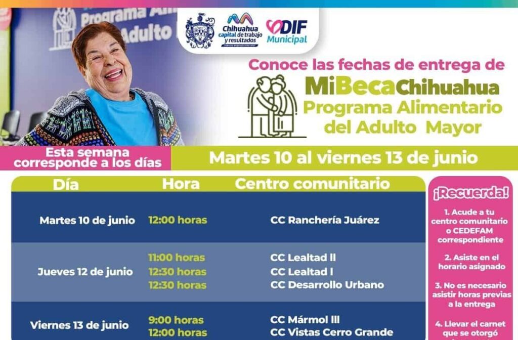 Chihuahua. – El Gobierno Municipal por medio del DIF, informa a las y los solicitantes del Programa Alimentario del Adulto Mayor (PAAM) los centros comunitarios y horarios en los que podrán acudir por su paquete alimentario del 10 al 13 de junio.