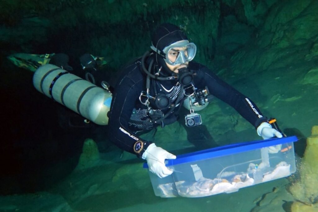 El arqueólogo Luis Alberto Martos López, asesor académico del proyecto, detalló que el esqueleto masculino fue localizado a ocho metros de profundidad y 200 metros de penetración dentro de un cenote.