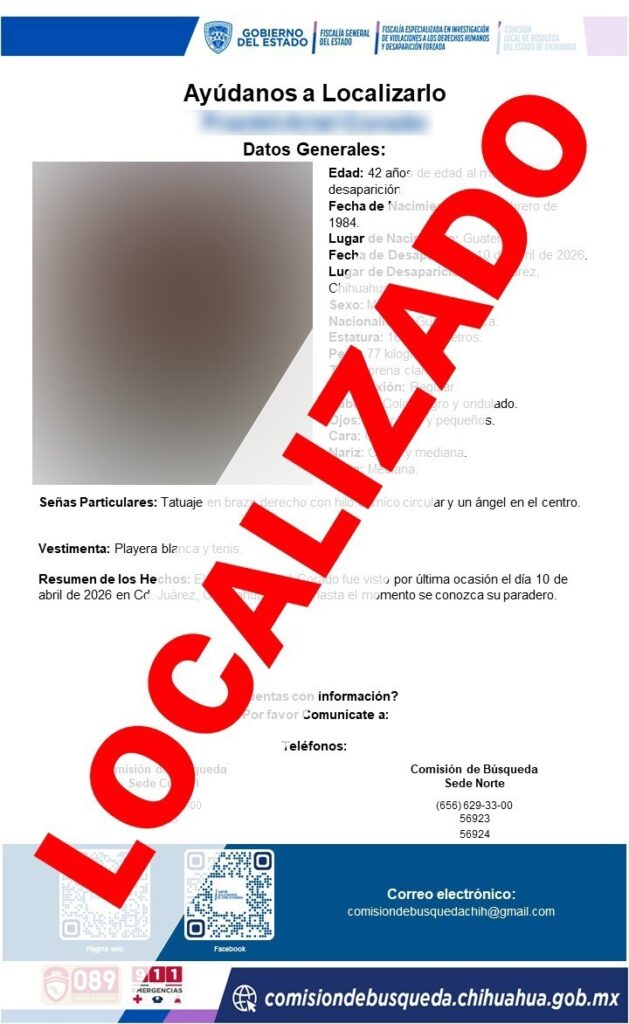 En el marco de la colaboración interinstitucional con los consulados de otros países, la Comisión Local de Búsqueda, dependiente de la Fiscalía Especializada en Violaciones a Derechos Humanos y Desaparición Forzada, de la Fiscalía General del Estado, localizó sano y salvo a un hombre de origen guatemalteco que se encontraba desaparecido en Ciudad Juárez.