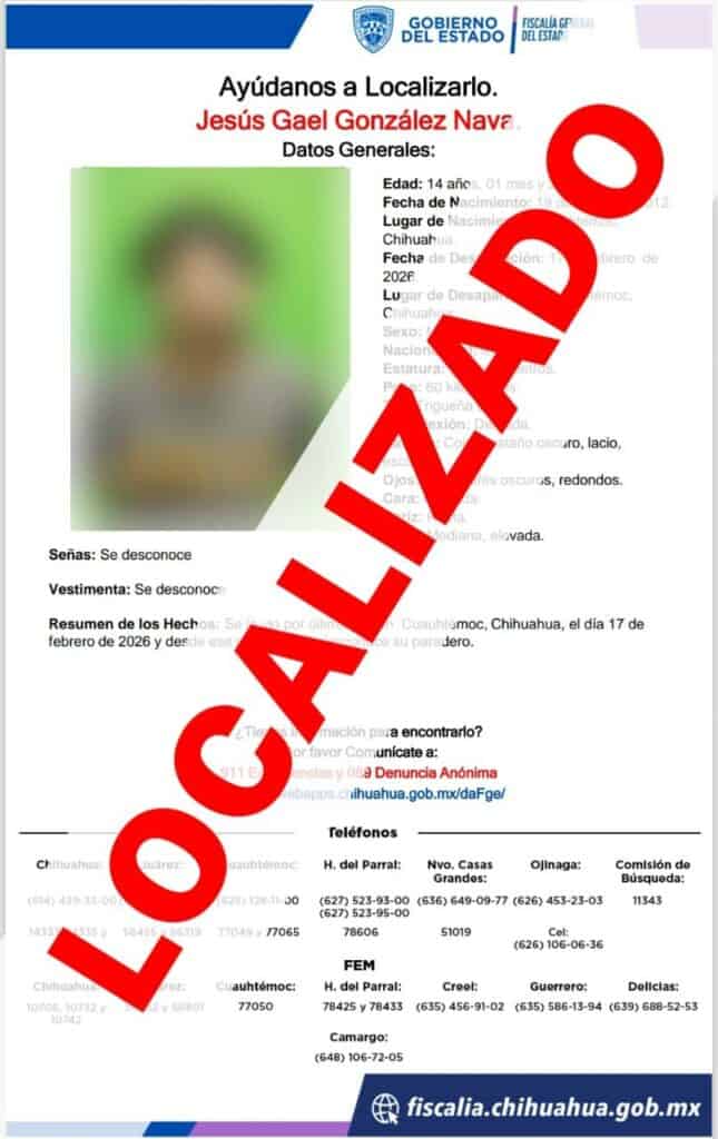 La Fiscalía de Distrito Zona Occidente localizó a salvo a dos de tres menores de edad, quienes habían sido reportados desaparecidos el pasado 17 de febrero del 2026 luego de salir del albergue en el que se encontraban.