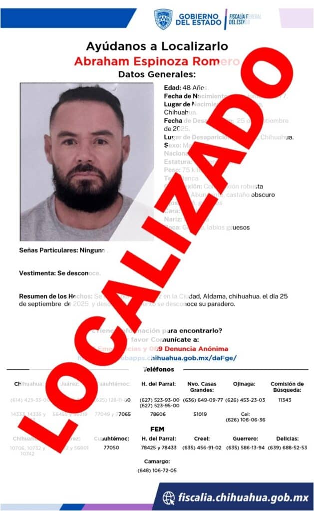 La Unidad de Investigación de Personas Ausentes y/o No Localizadas de la Fiscalía de Distrito Zona Centro (FDZC), localizó sano y salvo a Abraham E. R., de 48 años de edad, quien contaba con reporte de ausencia interpuesto en ciudad Aldama.