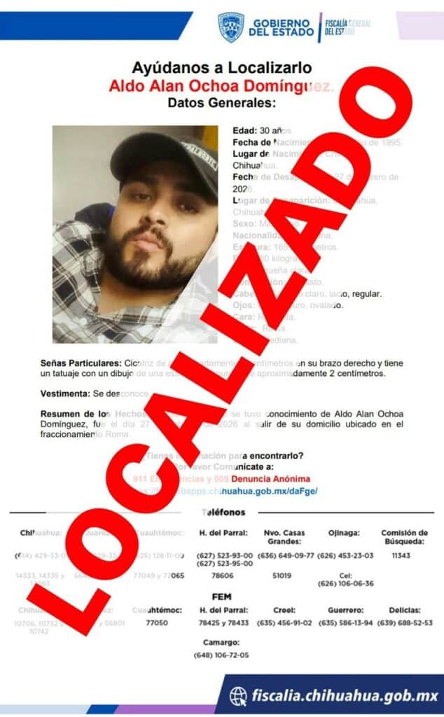 La Unidad de Investigación de Personas Ausentes y/o No Localizadas de la Fiscalía de Distrito Zona Centro (FDZC) encontró sanos y salvos a Fernando Lorenzo C. R., de 65 años de edad, y a Aldo Alan O. D., de 30 años de edad, quienes tenían reporte de ausencia interpuesto en la ciudad de Chihuahua.