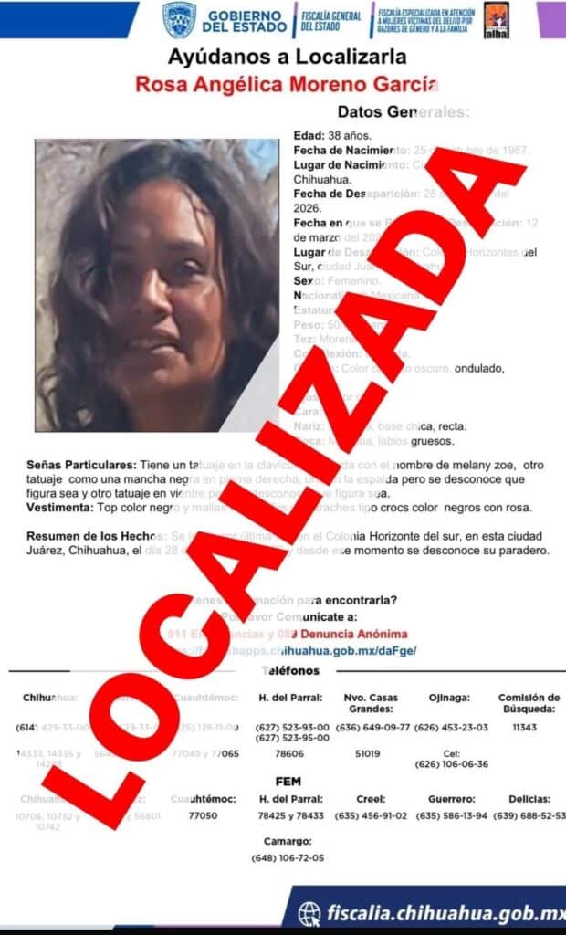 Elementos de la Fiscalía Especializada en Atención a Mujeres Víctimas del Delito por Razones de Género y a la Familia de la Zona Norte, localizaron sana y salva a Rosa Angélica M. G., de 38 de edad, quien contaba con reporte de desaparición y/o ausencia desde el día 28 de febrero, en Ciudad Juárez.