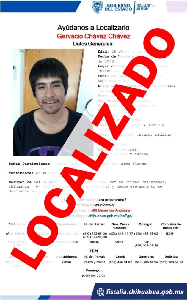 La Fiscalía de Distrito Zona Occidente dio por concluida la carpeta de investigación iniciada con motivo del reporte de desaparición que presentaron familiares de Gervacio C. C., de 26 años de edad.
