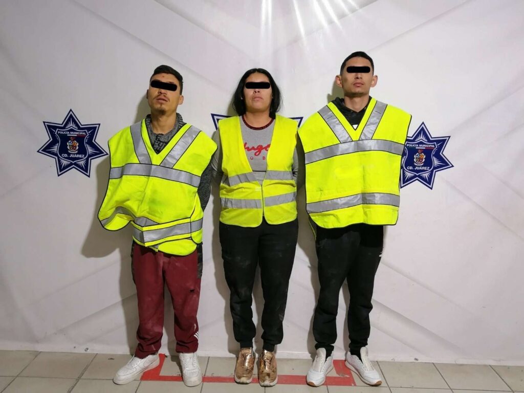 Ciudad Juárez -. Elementos de la Secretaría de Seguridad Pública Municipal arrestaron a Elizabeth C. S., Luis Rolando. E. M. y Jorge Luis D. M., por su presunta responsabilidad en la comisión de los delitos de posesión de vehículo con reporte de robo y violación a la ley federal de armas de fuego y explosivos.