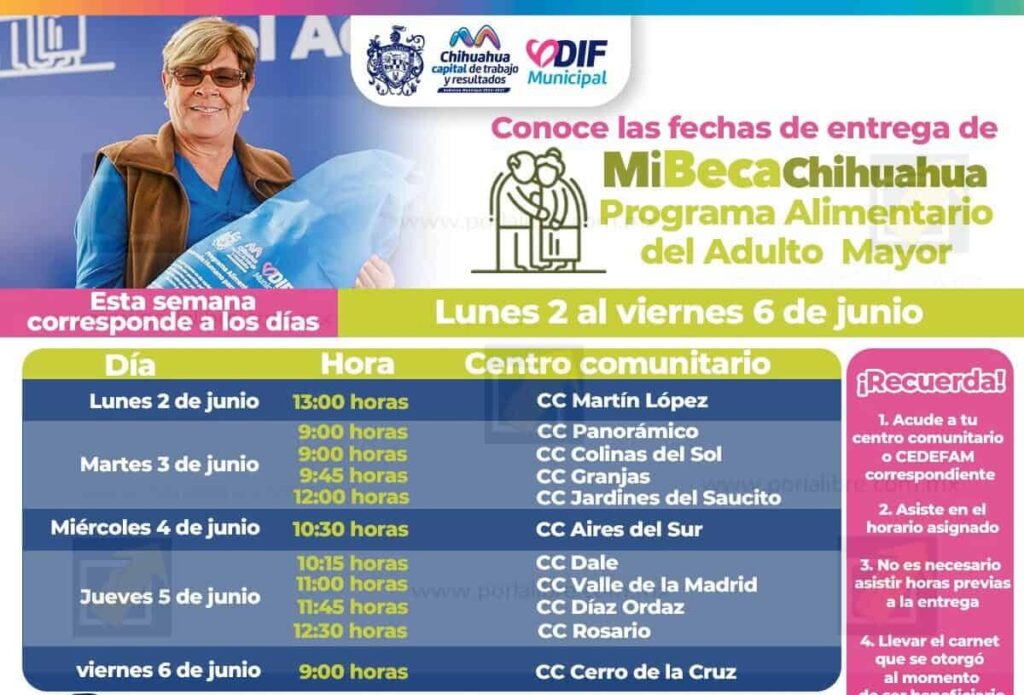 Chihuahua .- En atención al compromiso que el Gobierno Municipal tiene con las y los adultos mayores de Chihuahua Capital, para garantizarles una mejor calidad de vida, a través del DIF, se informa a las y los solicitantes del Programa Alimentario del Adulto Mayor (PAAM) los centros comunitarios y horarios en los que podrán acudir por su paquete alimentario del 02 al 06 de junio.