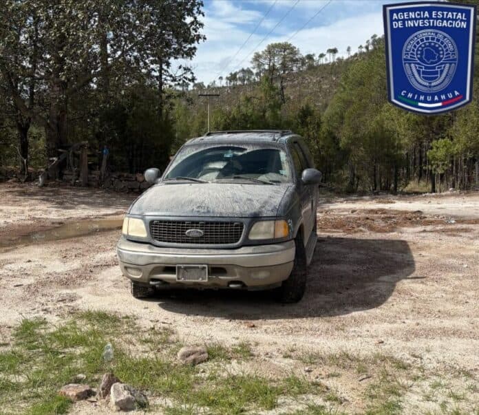 Elementos de la Agencia Estatal de Investigación (AEI) adscritos a la Fiscalía de Distrito Zona Sur, recuperaron una camioneta de la marca Ford, línea Expedition, modelo 2000, de color azul, reportada como robada hace tres días en el municipio de Guachochi.