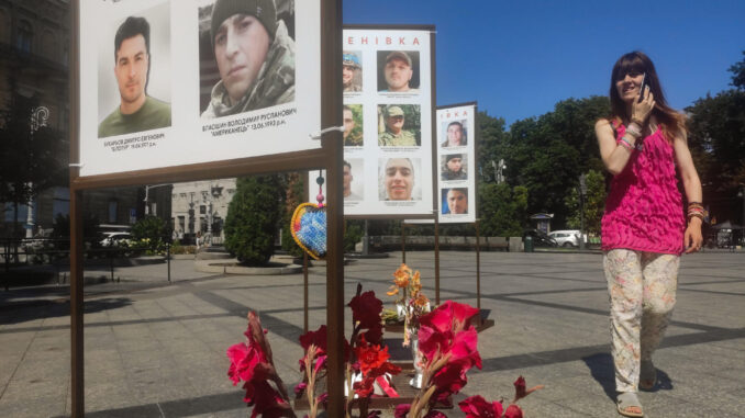 Shchekina acababa de asistir a una ceremonia de despedida en la plaza, donde funcionarios municipales, entre ellos el alcalde Andrí Sadoví, se unieron a residentes y turistas para rendir homenaje a los soldados caídos.