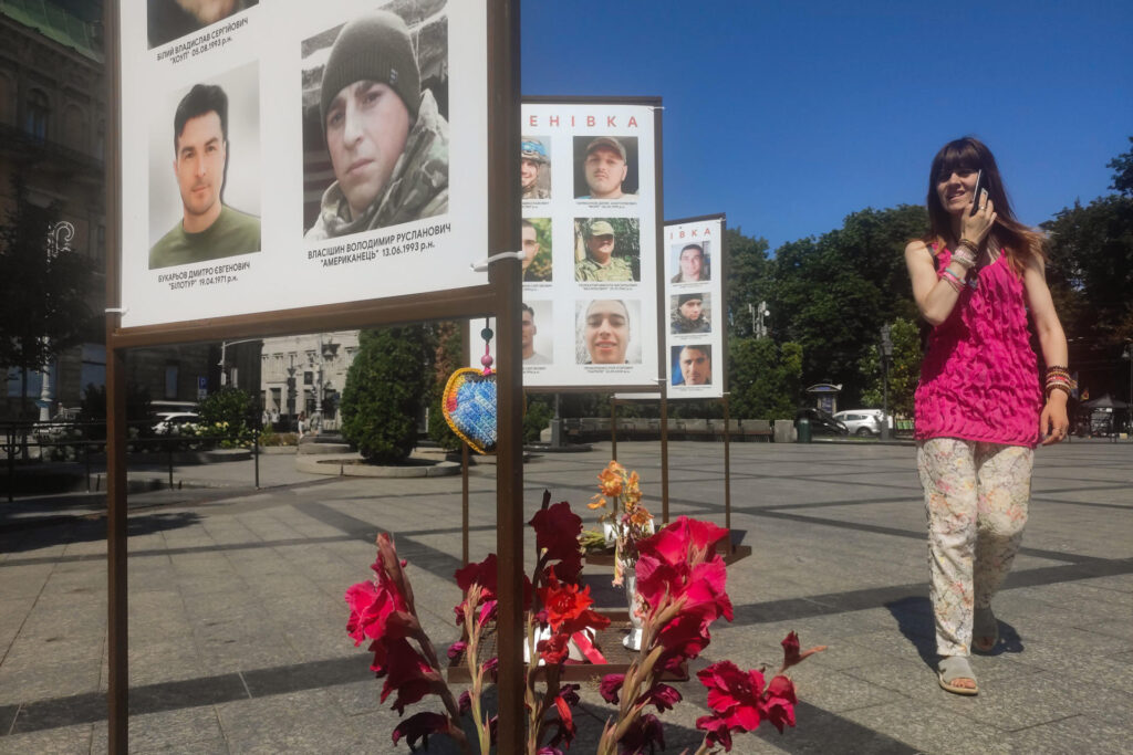 Shchekina acababa de asistir a una ceremonia de despedida en la plaza, donde funcionarios municipales, entre ellos el alcalde Andrí Sadoví, se unieron a residentes y turistas para rendir homenaje a los soldados caídos.