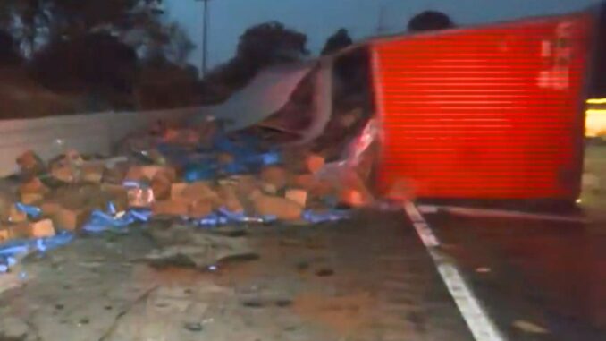 El tráiler cargaba botellas de shampoo, mismas que quedaron regadas sobre la cinta asfáltica.